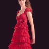 Короткое шифоновое вечернее платье на тонких бретелях с V образным вырезом. Пояс декорирован расшитым кружевом подчеркивающим талию.