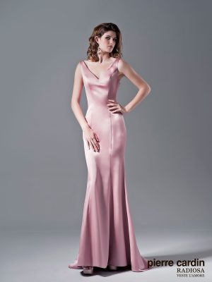 Pierre CardinЭлегантное вечернее платье от знаменитого бренда Pierre Cardin, силуэт русалка(рыбка), платье из атласа нежно-розового(пудрового) цвета с V-образным вырезом и полупрозрачной спинкой закрытой расшитым кружевом. Стильный шлейф.