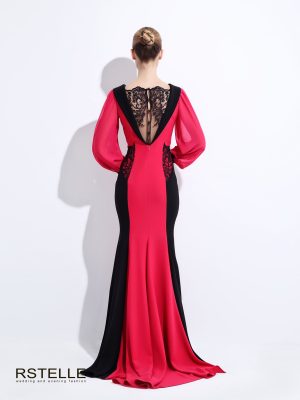 Стильное и элегантное расшитое кружевное вечернее платье силуэта русалка(рыбка) с длинными летящими шифоновыми рукавами, цвет красно-черный, вертикальные линии делают фигуру идеально стройной, кружево придает нежность, закрытый верх, юбка со шлейфом. Есть большие размеры.