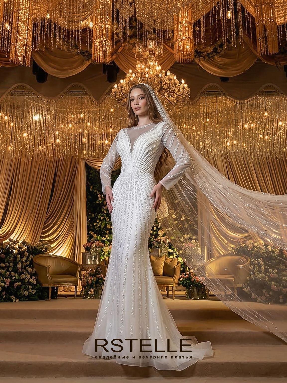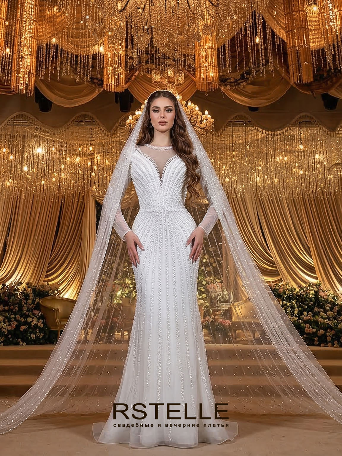 | Преимущества: | подчеркивает грудь, V образный вырез, вырез лодочкой, закрытая спина, закрытые плечи, закрытый верх, платье с рукавами, расшитое, шлейф |